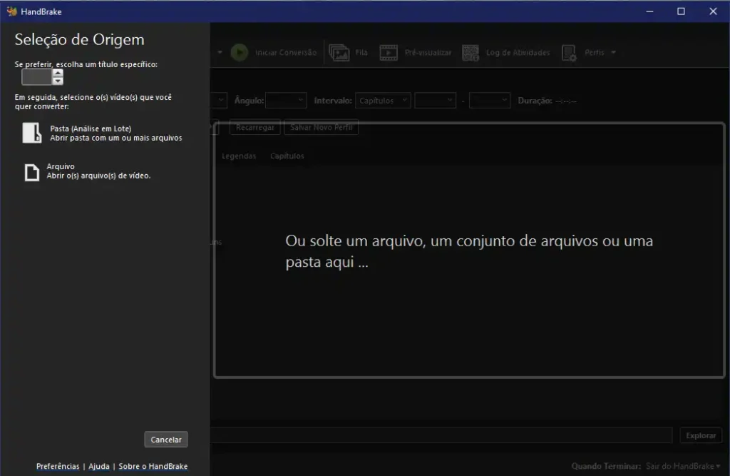 Abra o HandBrake e arraste seu MP4 pra dentro da janela. Ou clique em “Arquivo” se você for do tipo formal. Até aqui, sem drama.