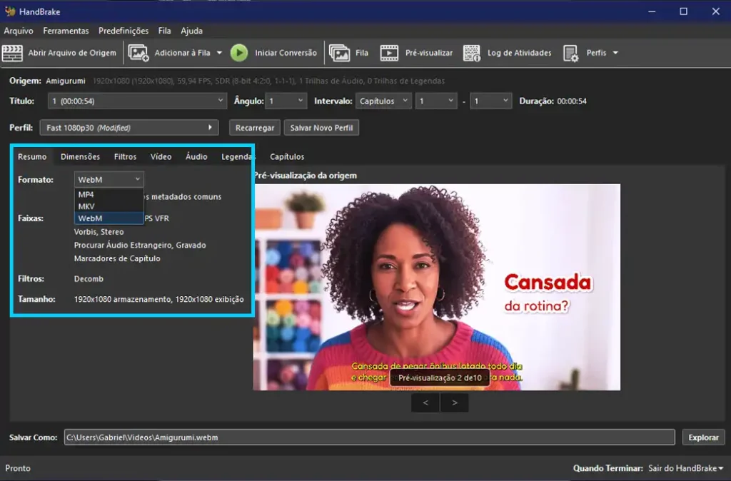 - Codec: O HandBrake costuma puxar Opus automaticamente quando você escolhe WebM. Deixa ele fazer o trabalho.