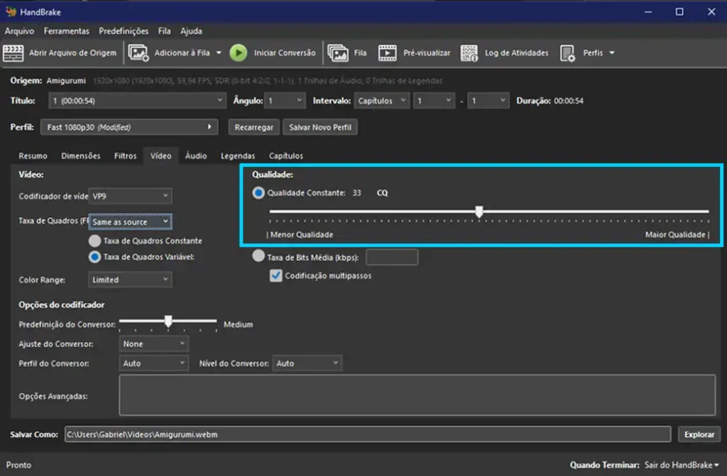 - Quality (Constant Quality): Esse é o slider mágico que controla o peso do arquivo.