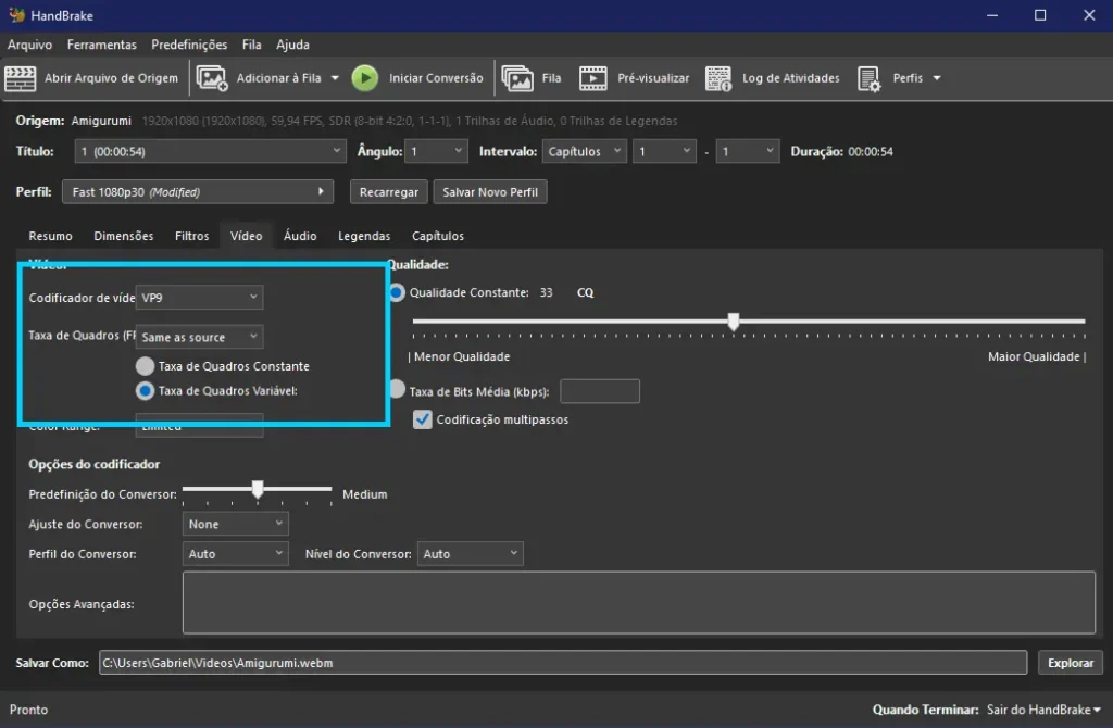 Lá embaixo, na barra “Save As”, dê um nome pro arquivo. Garanta que termine em .webm.