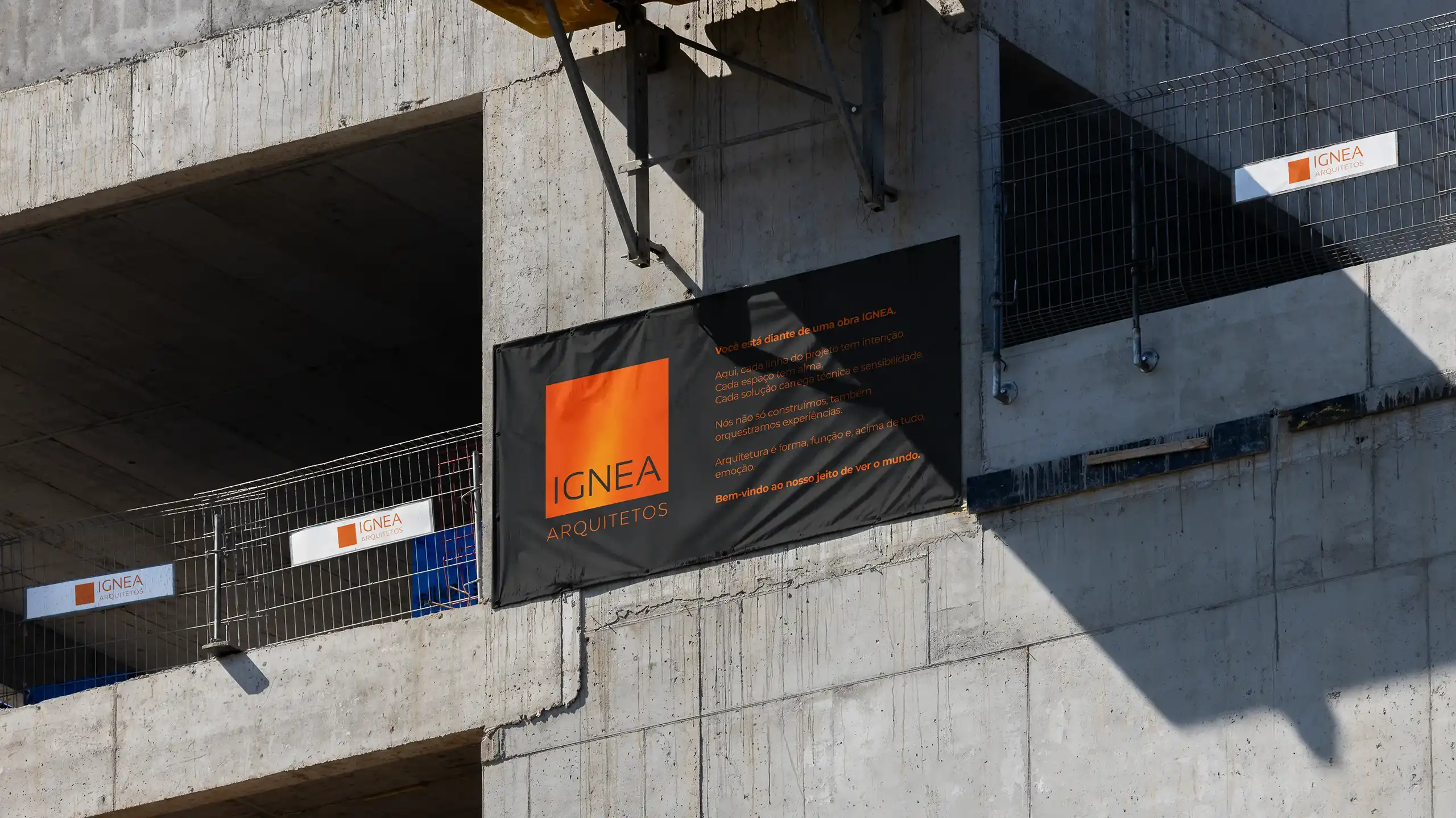 A paleta de cores foi pensada como a fundação de um projeto arquitetônico. Azul escuro para confiança, expertise e seriedade — é a cor que diz “você está em boas mãos”. Tons de bronze e ouro para valor, qualidade e sofisticação — aquele toque que diferencia. E off-white para clareza, espaço e organização — porque um bom projeto respira.