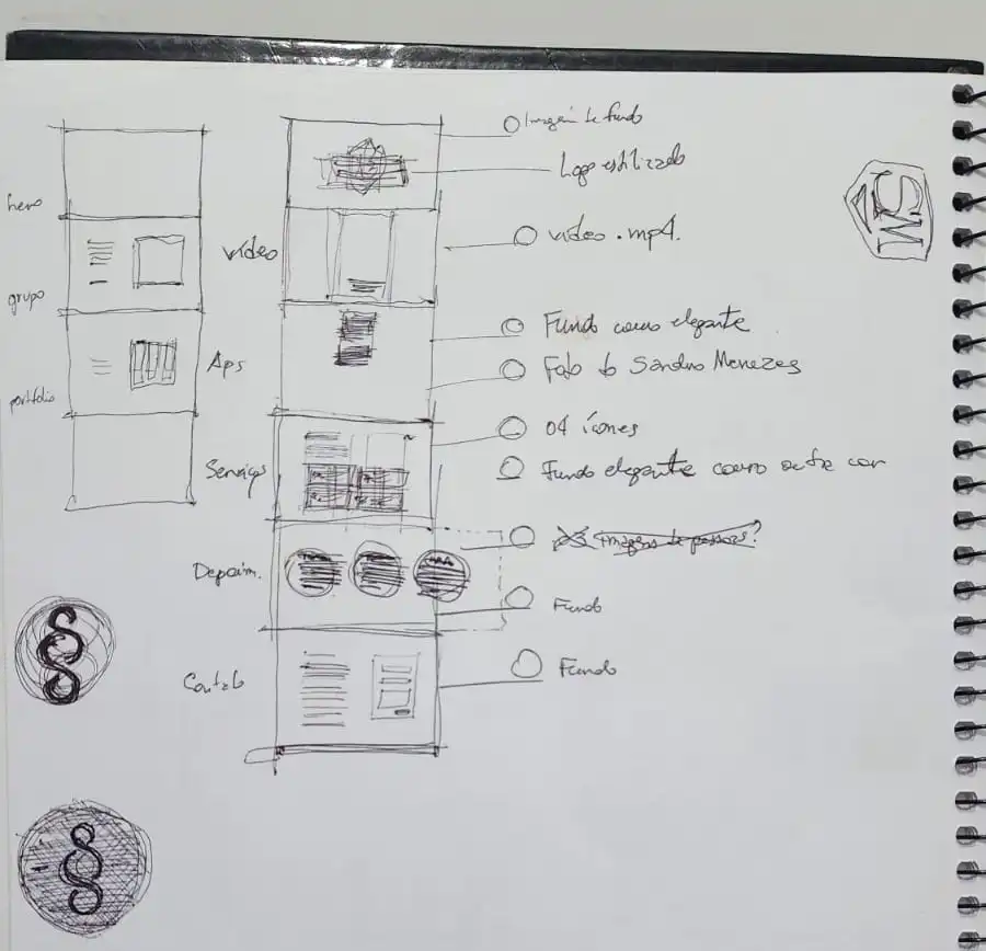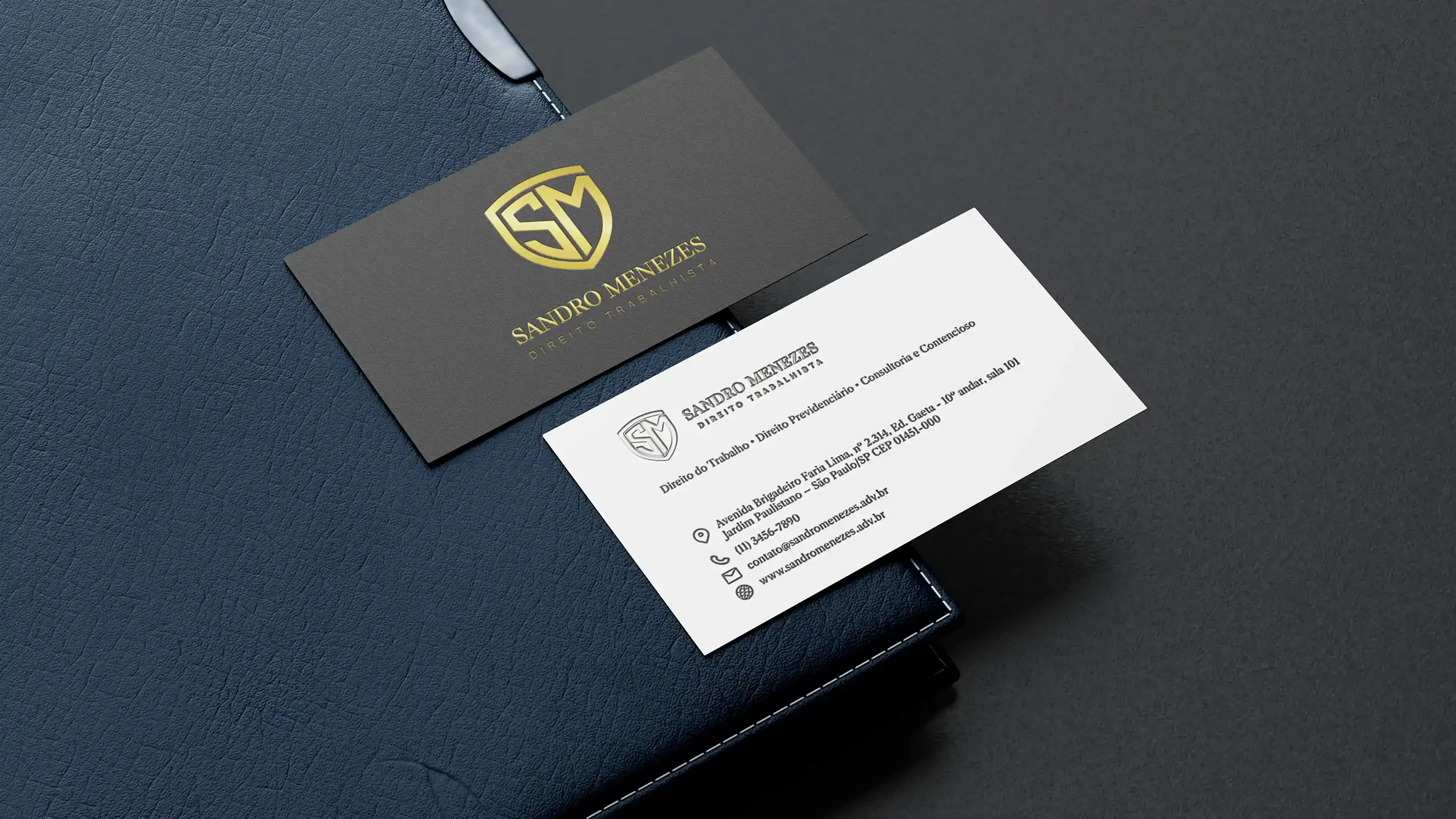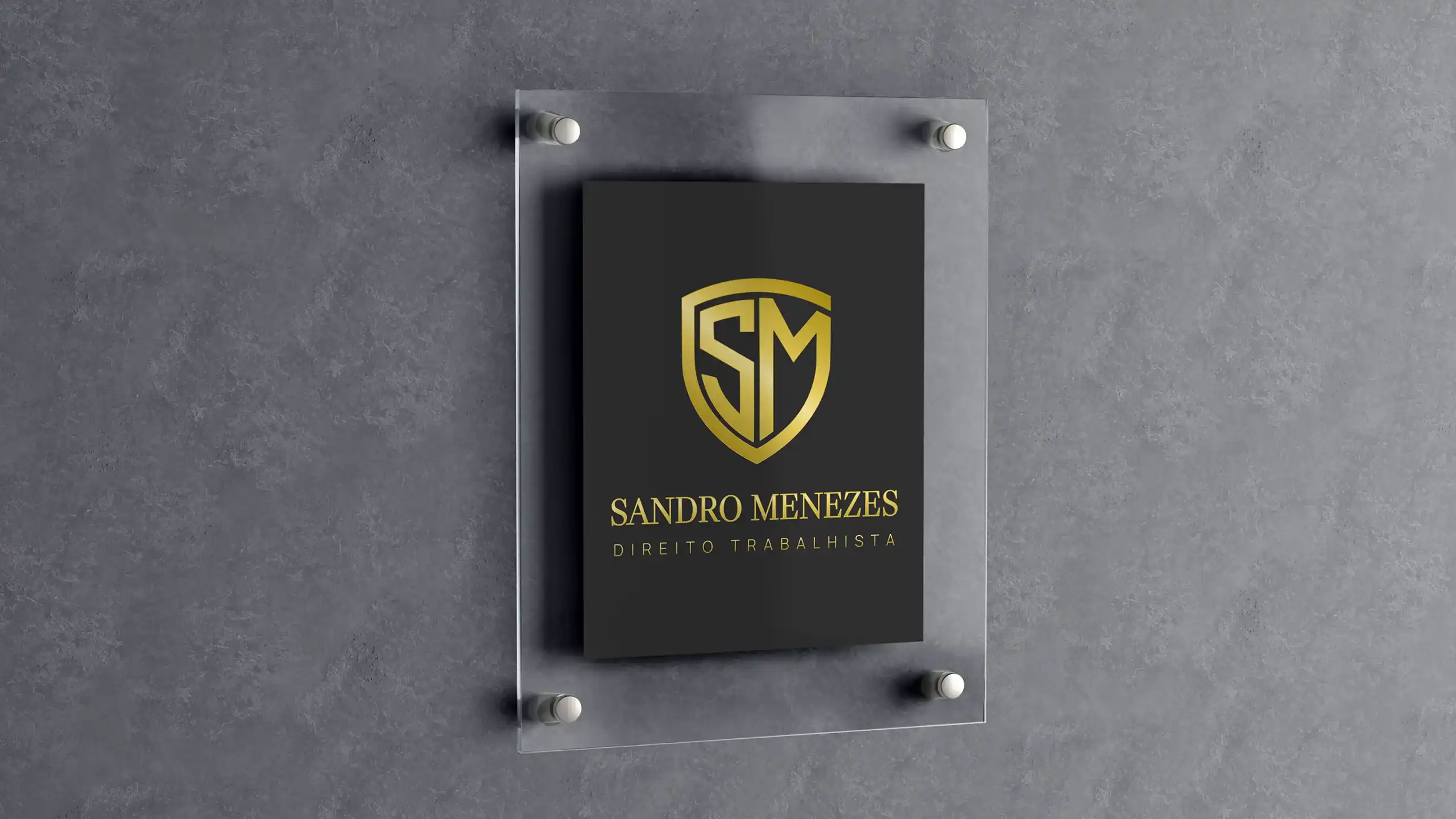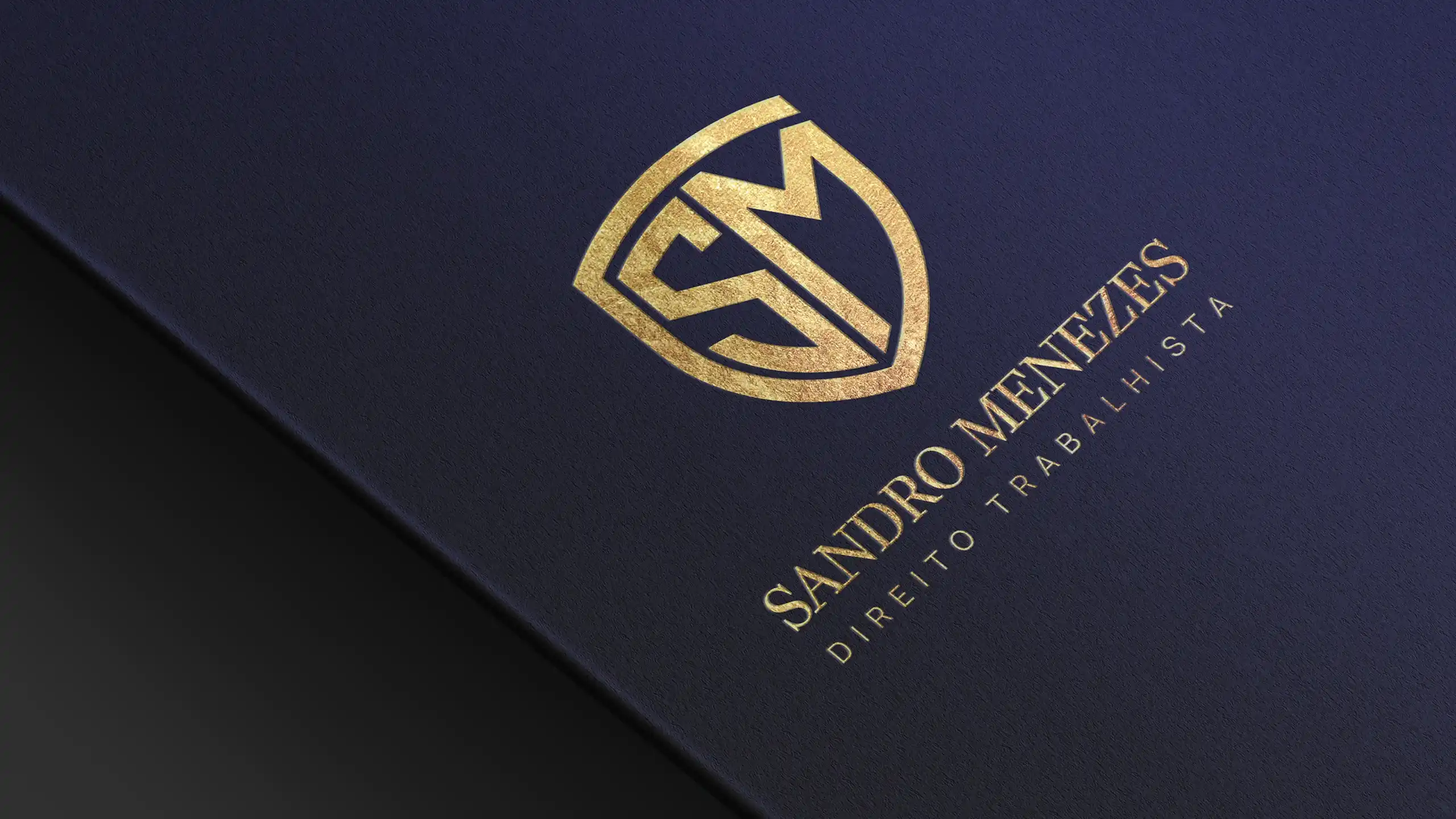 A identidade visual começou com o logotipo. Criei um monograma arquitetônico que une as iniciais S e M de forma que também lembrasse um escudo. É minimalista, mas carrega significado: solidez e proteção. Não é aquela balança genérica que todo advogado usa. É algo que diz “aqui você está protegido”.