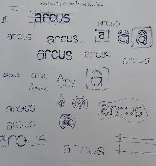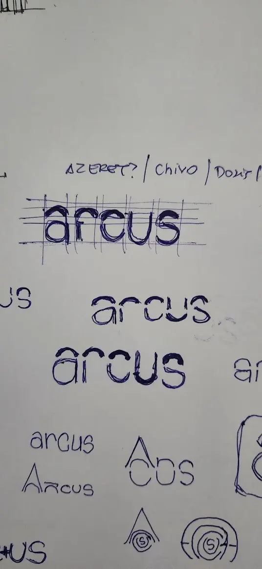 Comecei com papel e caneta, explorando formas, proporções e possibilidades. Rabisquei dezenas de variações do nome “Arcus”, testando como integrar a ideia do arco de forma orgânica, sem forçar. Algumas versões eram muito decorativas. Outras, técnicas demais. Até que encontrei o equilíbrio: uma tipografia fluida, tridimensional e arredondada, com um gradiente de azuis que cria profundidade e movimento.