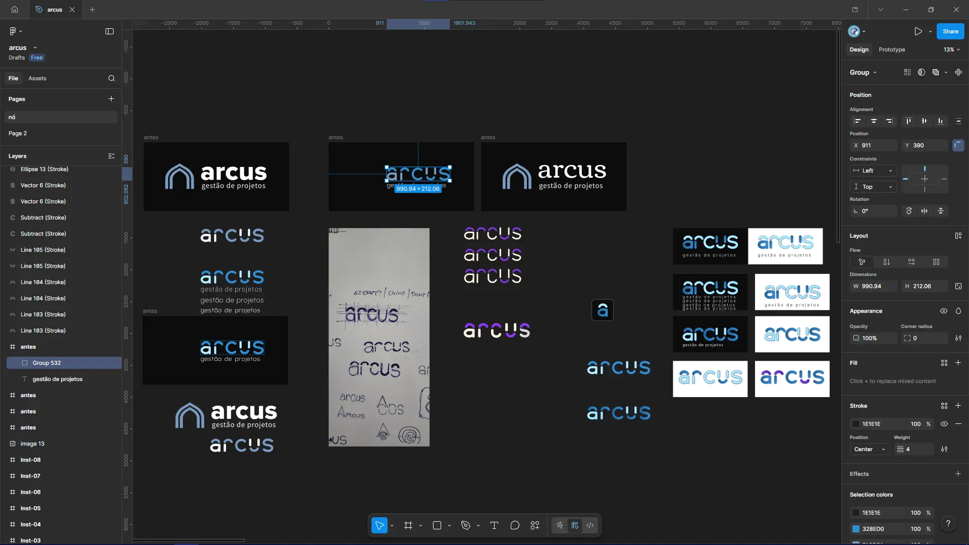 Digitalizei tudo no Figma, refinei proporções, testei a legibilidade em diversos tamanhos e contextos (desde favicon até outdoor). Criei as variações necessárias: versão horizontal, versão vertical, versão em negativo, versão monocromática.