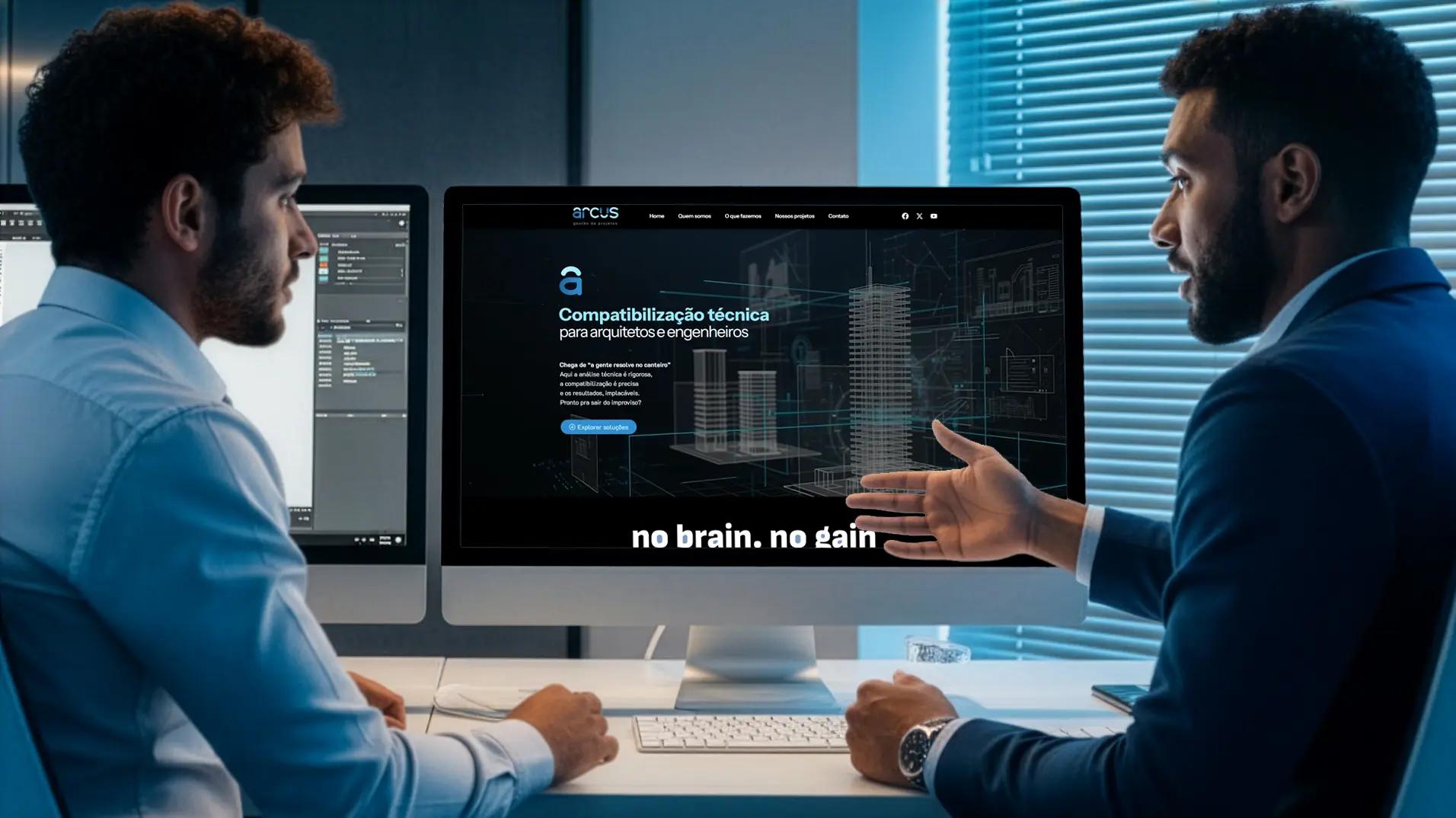 Essa dualidade era exatamente o que precisávamos comunicar: a Arcus resolve problemas complexos (coordenação BIM, compatibilização de projetos multidisciplinares, detecção de interferências) de forma aparentemente simples e elegante. A tecnologia está ali, mas não se impõe. Ela serve.