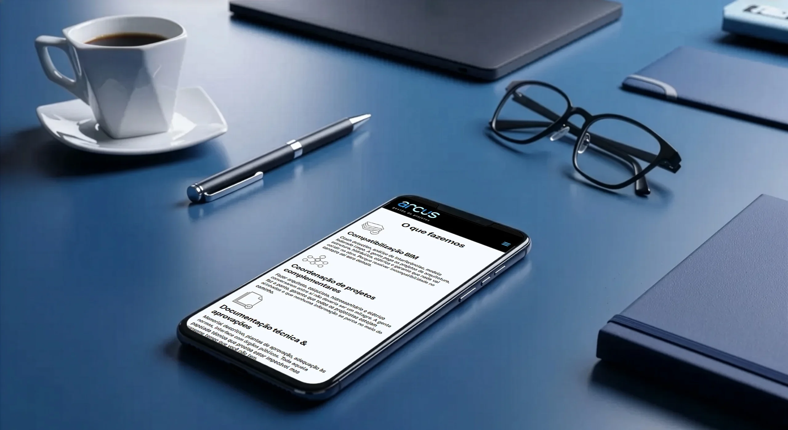 O diagnóstico era direto: a Arcus precisava de uma marca que conversasse B2B com autoridade técnica, mas refletisse sua essência disruptiva — um escritório que usa tecnologia de ponta para eliminar retrabalho e humanizar processos.