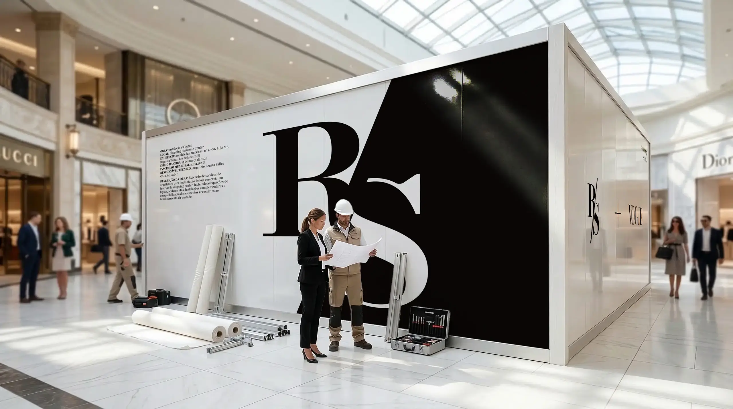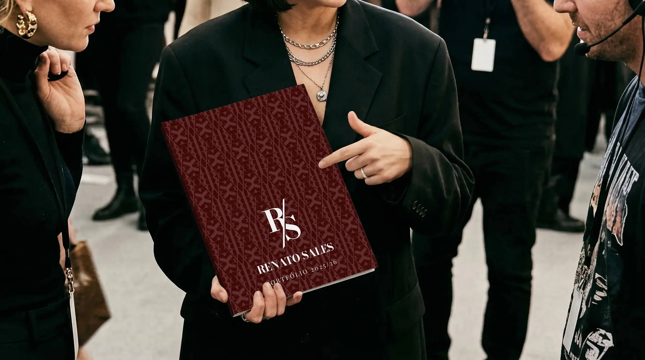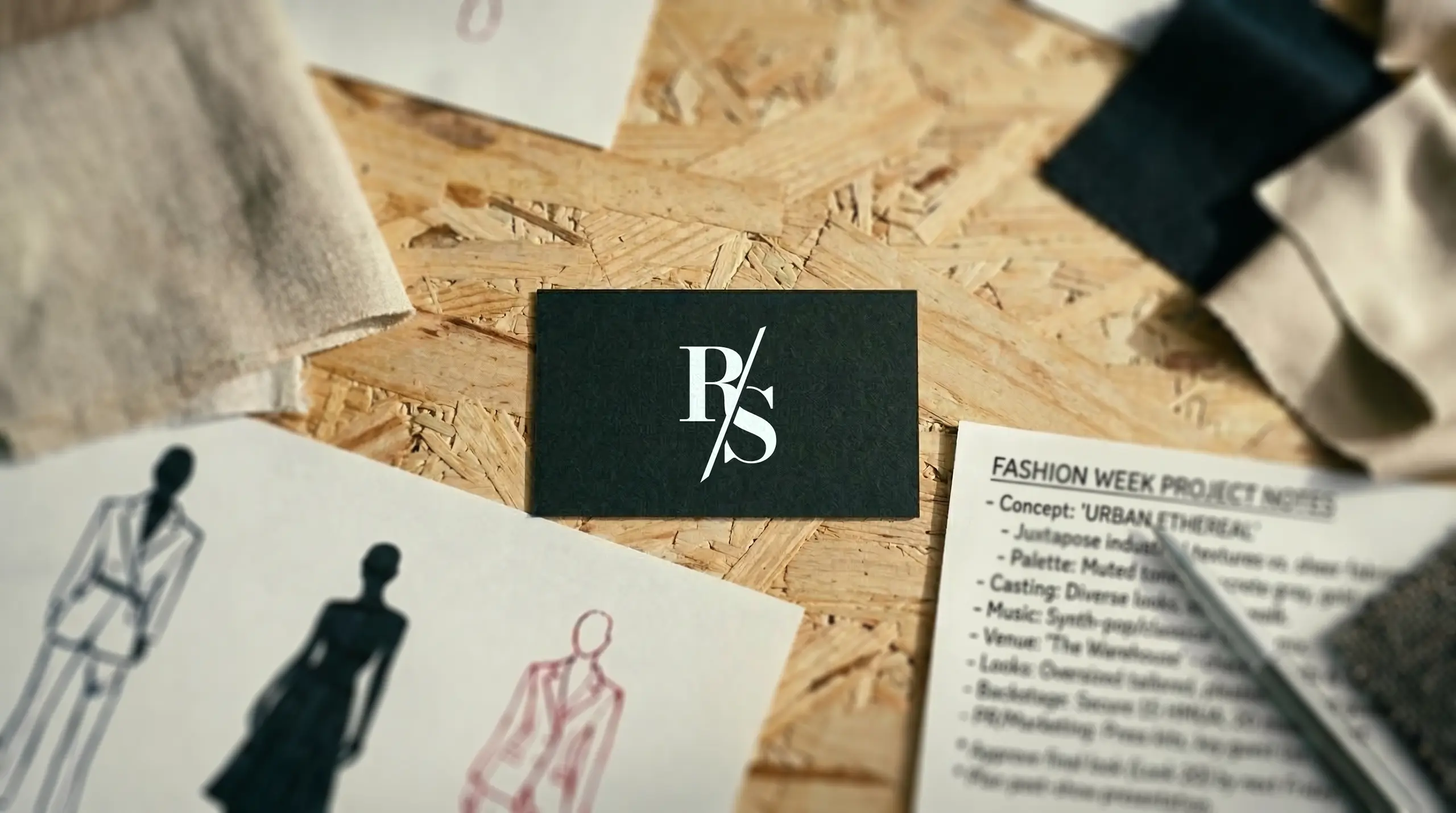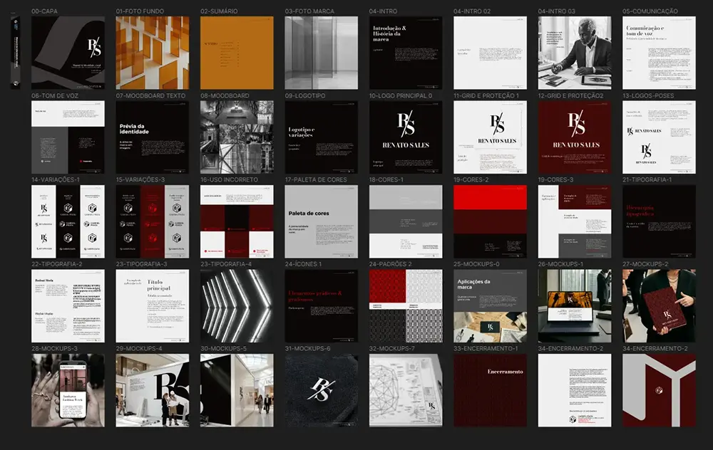 A identidade gráfica reforça o mesmo pensamento. O monograma RS, a escolha tipográfica, a paleta restrita e os módulos visuais criam uma marca que parece consistente com o universo construído. Não há ruído, nem excesso ornamental gratuito. A estrutura tenta refletir a mesma disciplina do personagem.
