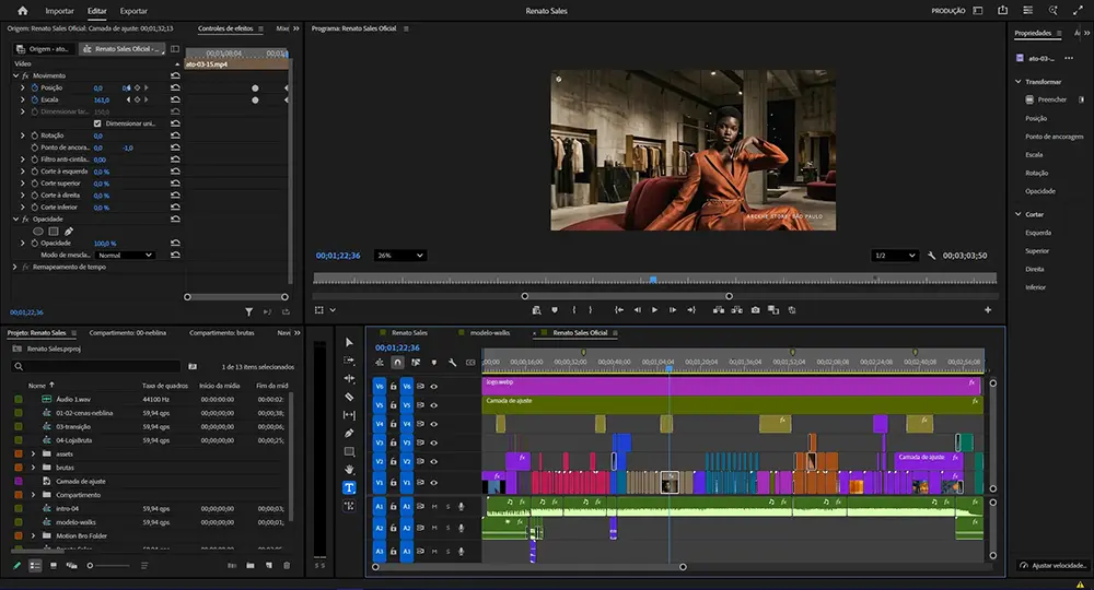 O ritmo muda conforme o ambiente: uma materialidade ancestral na abertura, delicado e material na loja, mais tenso e dinâmico na passarela e silencioso e íntimo na galeria final.