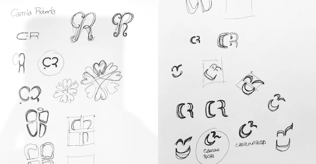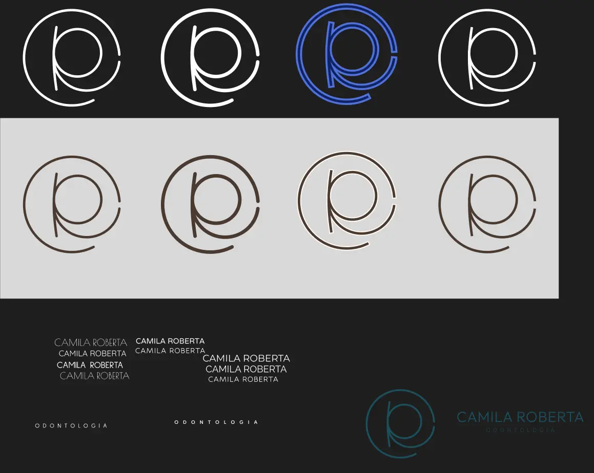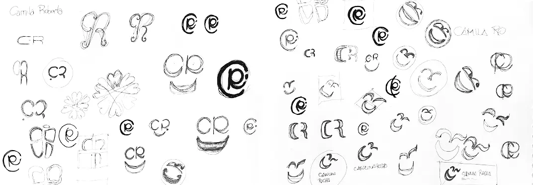 Comecei a desconstruir a forma, limpando os excessos, até começar a brincar geometricamente com as iniciais da Camila Roberta (“C” e “R”). Testamos, iteramos e desenhamos incansavelmente. Avaliamos a espessura das linhas, o rigor dos traços uniformes e fugimos de qualquer gradiente datado. O resultado foi um monograma arquitetônico minimalista, onde o “C” abraça o “R” em uma proporção perfeita.