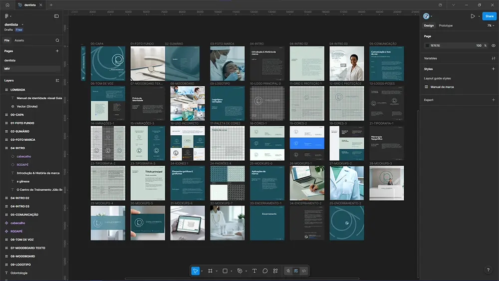 Na tipografia, a lógica foi a mesma: tentativa, erro e repertório. Rodamos testes com fontes arredondadas (como a Tsukimi e a Dongle) buscando amigabilidade, mas a leitura crítica mostrou que faltava o “peso clínico”. A solução foi pivotar e testar novamente até cravar a dupla Outfit e Mulish, que vestiram a marca com precisão cirúrgica e conforto de leitura.Para a paleta de cores, não houve intuição cega. Explorei exaustivamente as harmonias e combinações matemáticas através da ferramenta Adobe Color. A intenção era achar o ponto de intersecção exato entre o ambiente cirúrgico e o acolhimento, chegando aos tons documentados no manual: os off-whites, os cinzas frios e o toque de sofisticação do azul ardósia (Slate Blue).